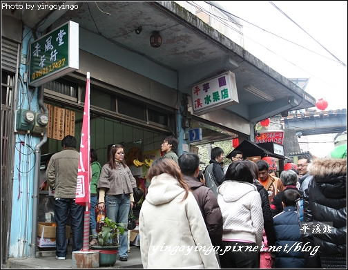 上面是火車的鐵軌,下面還畫著鐵路局的標誌哩,前面有許多人排隊吃小吃,二話不說,來平溪當然也要來吃吃小吃啦