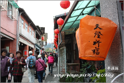 平溪老街左上面就是鐵軌了哩,左邊是一家生意很好的麵店"紅龜麵店",看著店的待洗的碗盤就知生意真是"好啊"