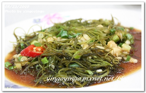 某種海菜嗎?!以涼拌式的做法,帶點醋、生蒜、蔥、醬油,挺清爽的